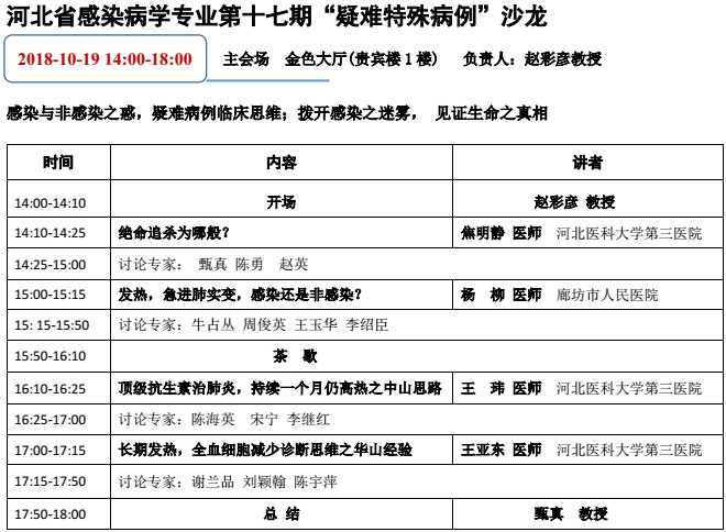 由河北醫(yī)學(xué)會(huì)感染病學(xué)分會(huì)、河北省醫(yī)師協(xié)會(huì)感染科醫(yī)師分會(huì)、河北省傳染病質(zhì)量管理與控制中心、石家莊市醫(yī)學(xué)會(huì)感染病學(xué)專業(yè)委員會(huì)共同主辦,河北醫(yī)科大學(xué)第三醫(yī)院湘江院區(qū)(肝病感染病分院)承辦的“2018河北省感染肝病精準(zhǔn)診療高峰論壇暨2018年河北省感染性疾病學(xué)術(shù)年會(huì)、第十一屆河北省感染科醫(yī)師培訓(xùn)班、第六屆河北省傳染病醫(yī)療質(zhì)量管理與控制培訓(xùn)會(huì)議”將于2018年會(huì)議內(nèi)容涉及感染病學(xué)專業(yè)相關(guān)指南與診療規(guī)范解讀、傳染病醫(yī)療質(zhì)量管理與控制、感染性疾病診療現(xiàn)狀及防控策略、抗生素合理應(yīng)用與耐藥菌防治、急危重與疑難復(fù)雜肝病的診療思路等臨床實(shí)踐中的熱點(diǎn)與難點(diǎn)問(wèn)題。同期 還將召開(kāi)第十七期《河北省感染病學(xué)專業(yè)疑難特殊病例沙龍》。